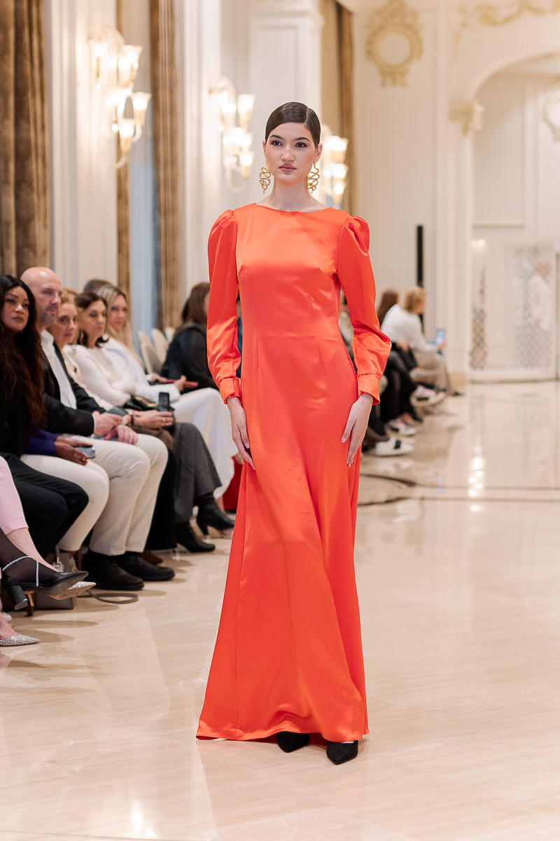 Vestido largo de gala en color naranja intenso, confeccionado en una tela satinada con acabado brillante, que refleja la luz con elegancia. El diseño presenta líneas limpias y minimalistas, con un corte recto y ceñido que estiliza la figura.