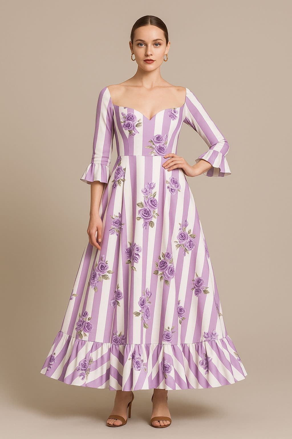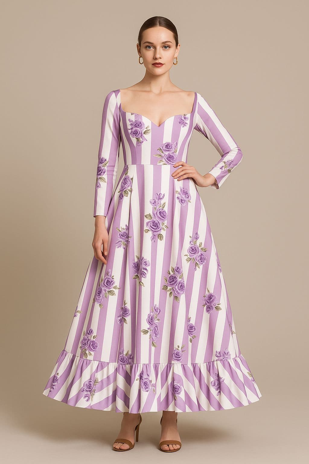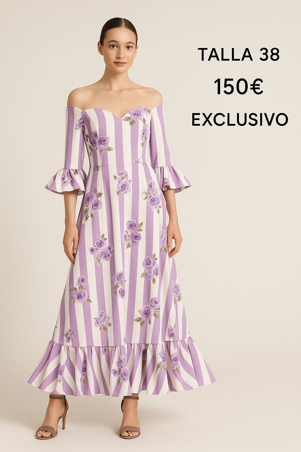 Diseñado y confeccionado artesanalmente en nuestro atelier, este vestido refleja la esencia de nuestra firma: elegancia, tradición y personalidad. Con un escote corazón que resalta la silueta femenina, y un estampado de rayas malva y blanco decorado con rosas en tonos lilas, es una pieza que transmite fuerza y dulzura a partes iguales.
