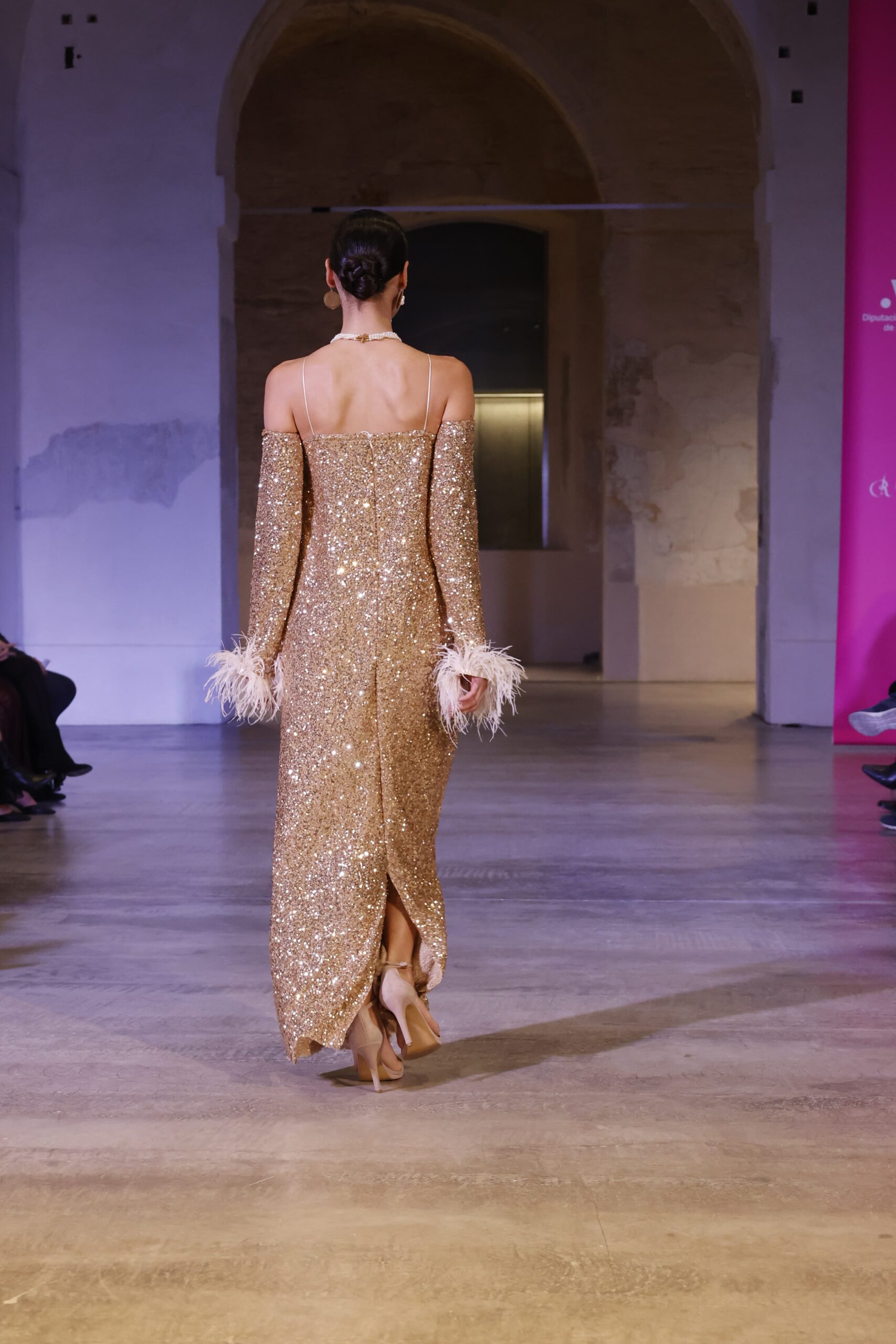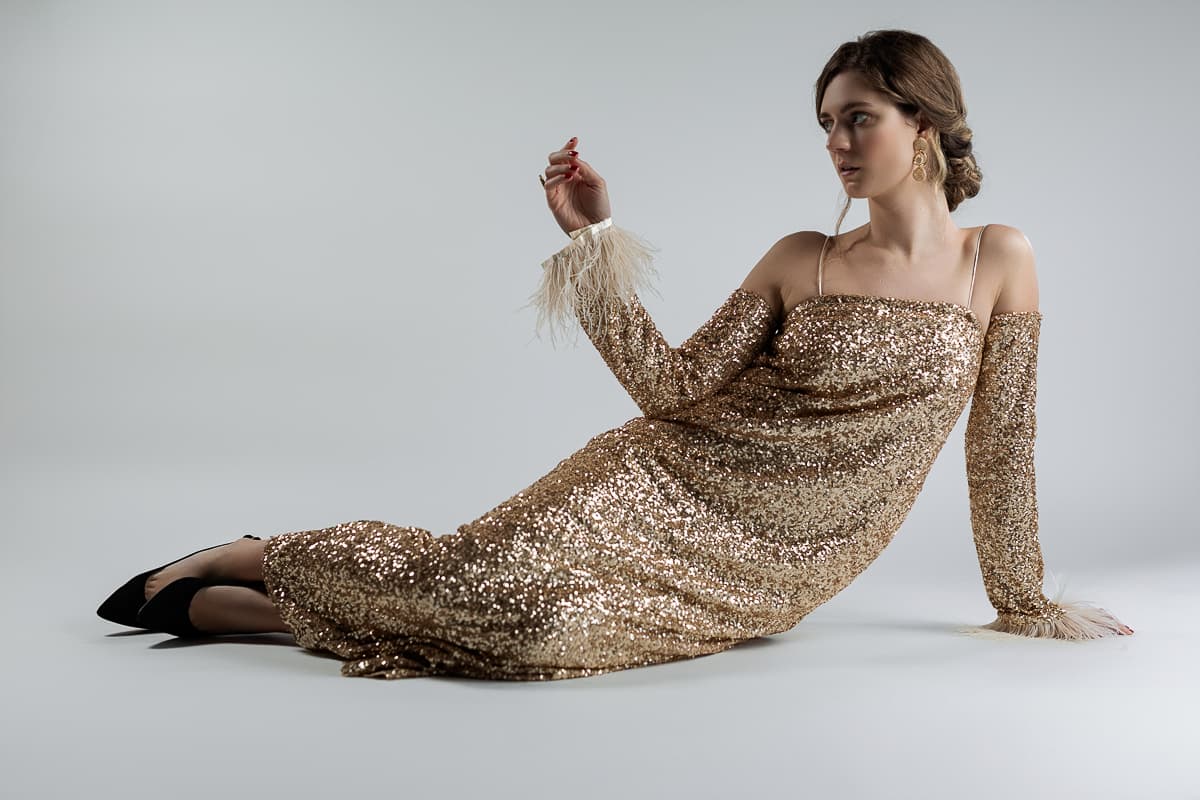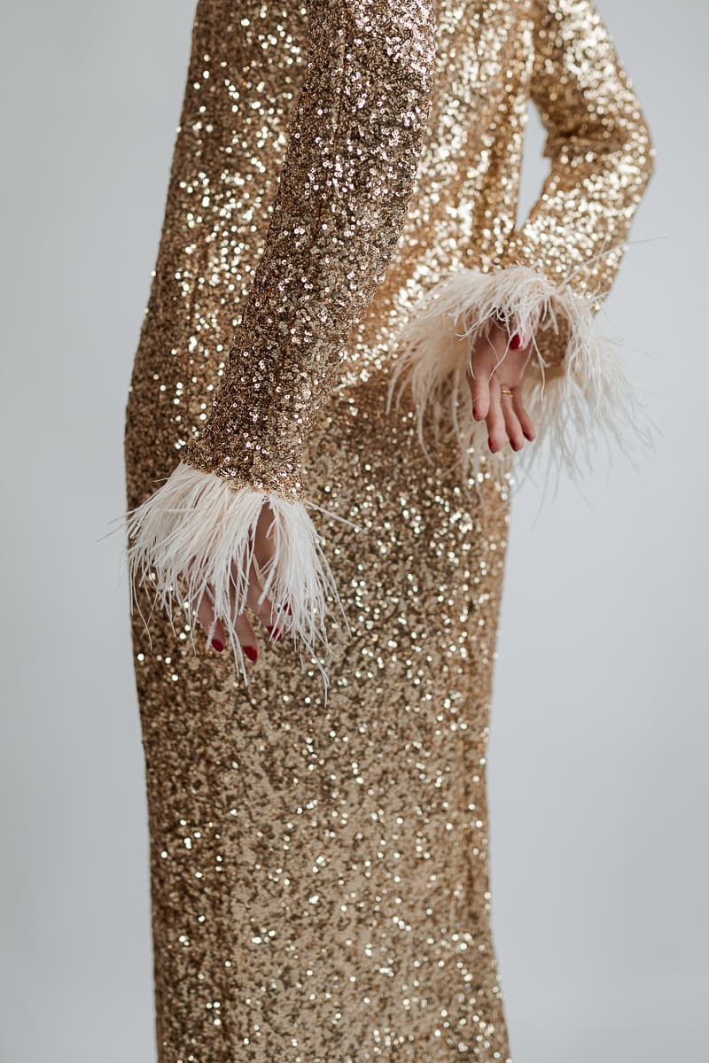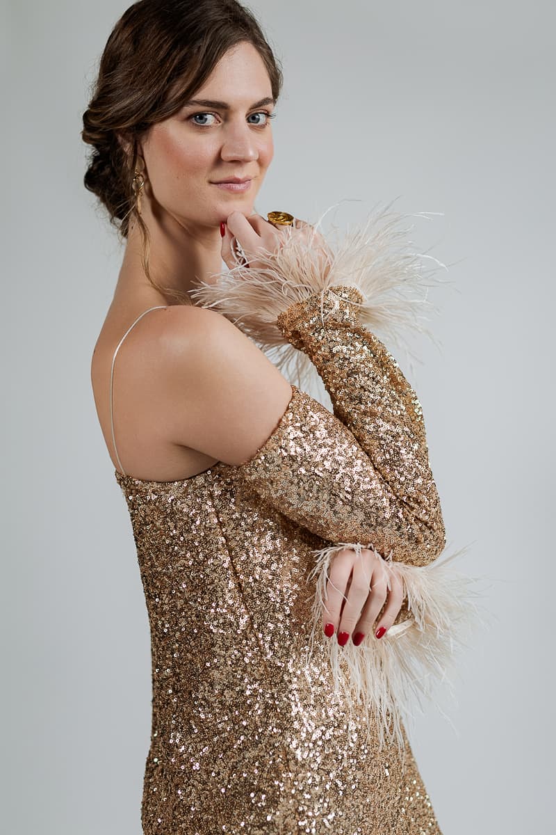 Vestido largo dorado con glitter y plumas