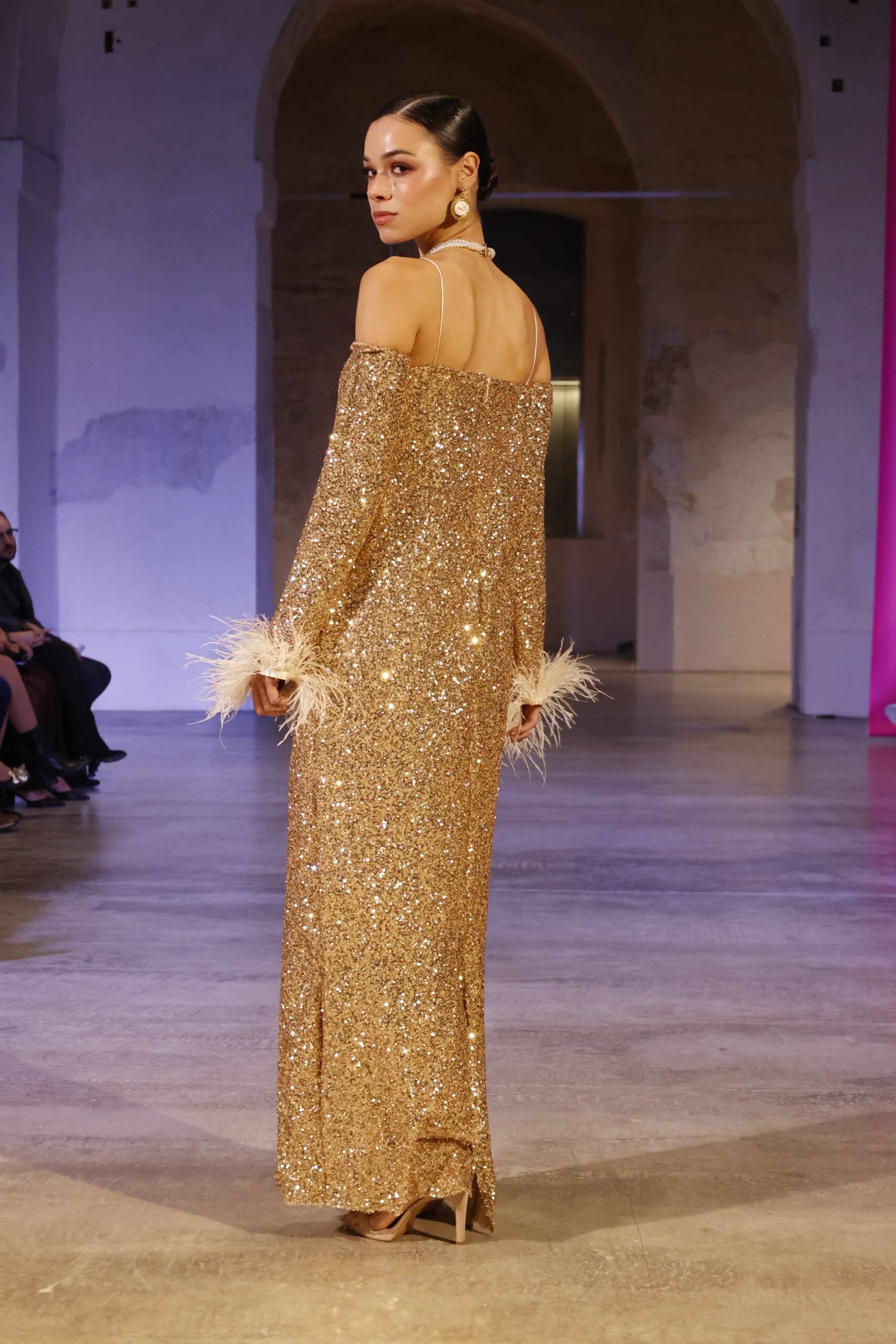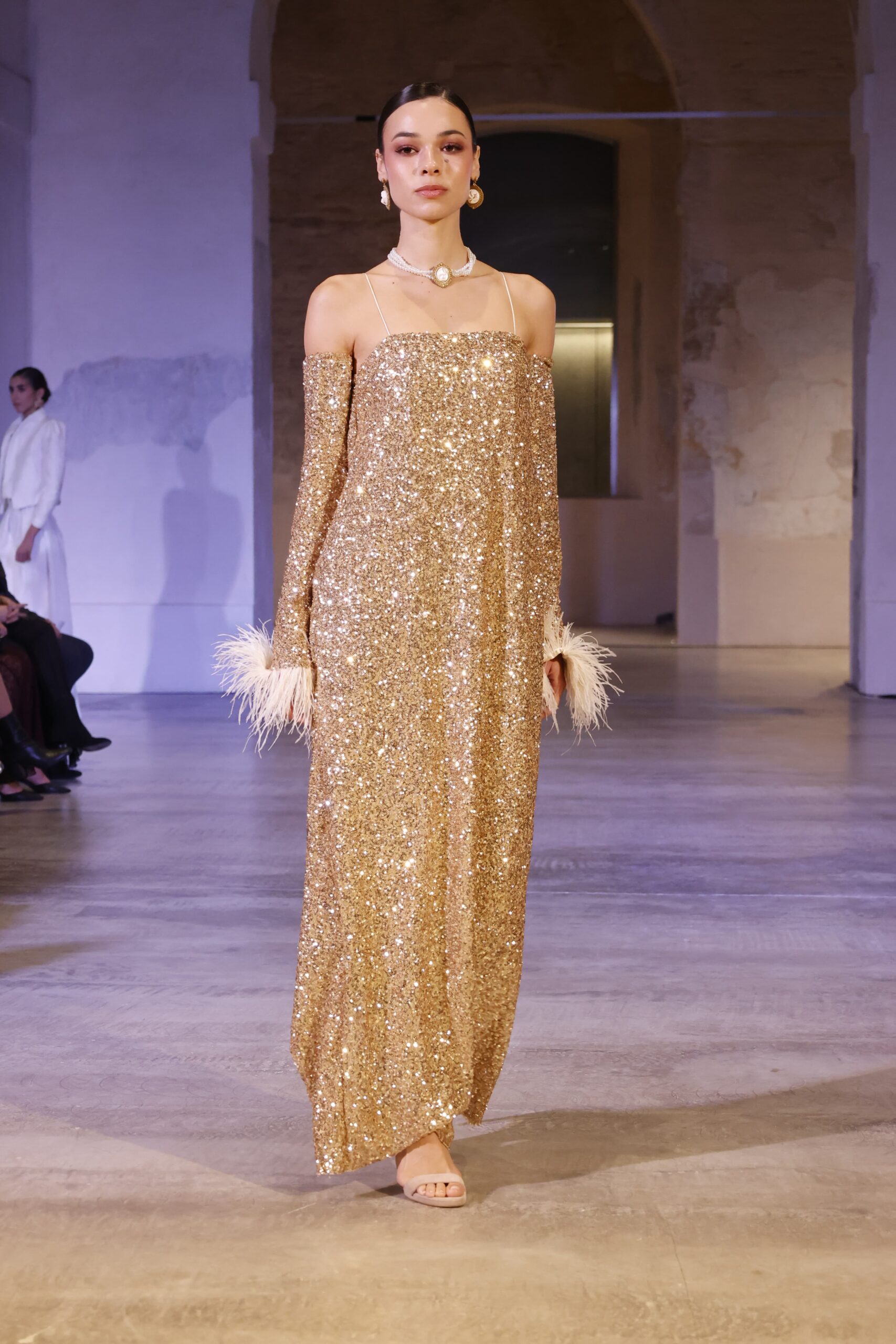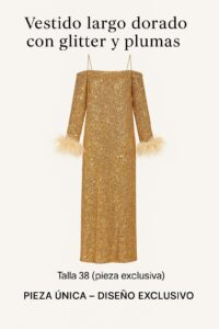Deslumbra en cada paso con este vestido largo confeccionado en tejido glitter dorado. Su diseño recto con hombros al aire y tirantes finos realza la silueta con elegancia. Las mangas largas terminan en puños de plumas suaves, aportando un toque sofisticado y lleno de movimiento. Ideal para eventos de noche, galas o invitadas especiales. Una pieza exclusiva, pensada para brillar con personalidad.
